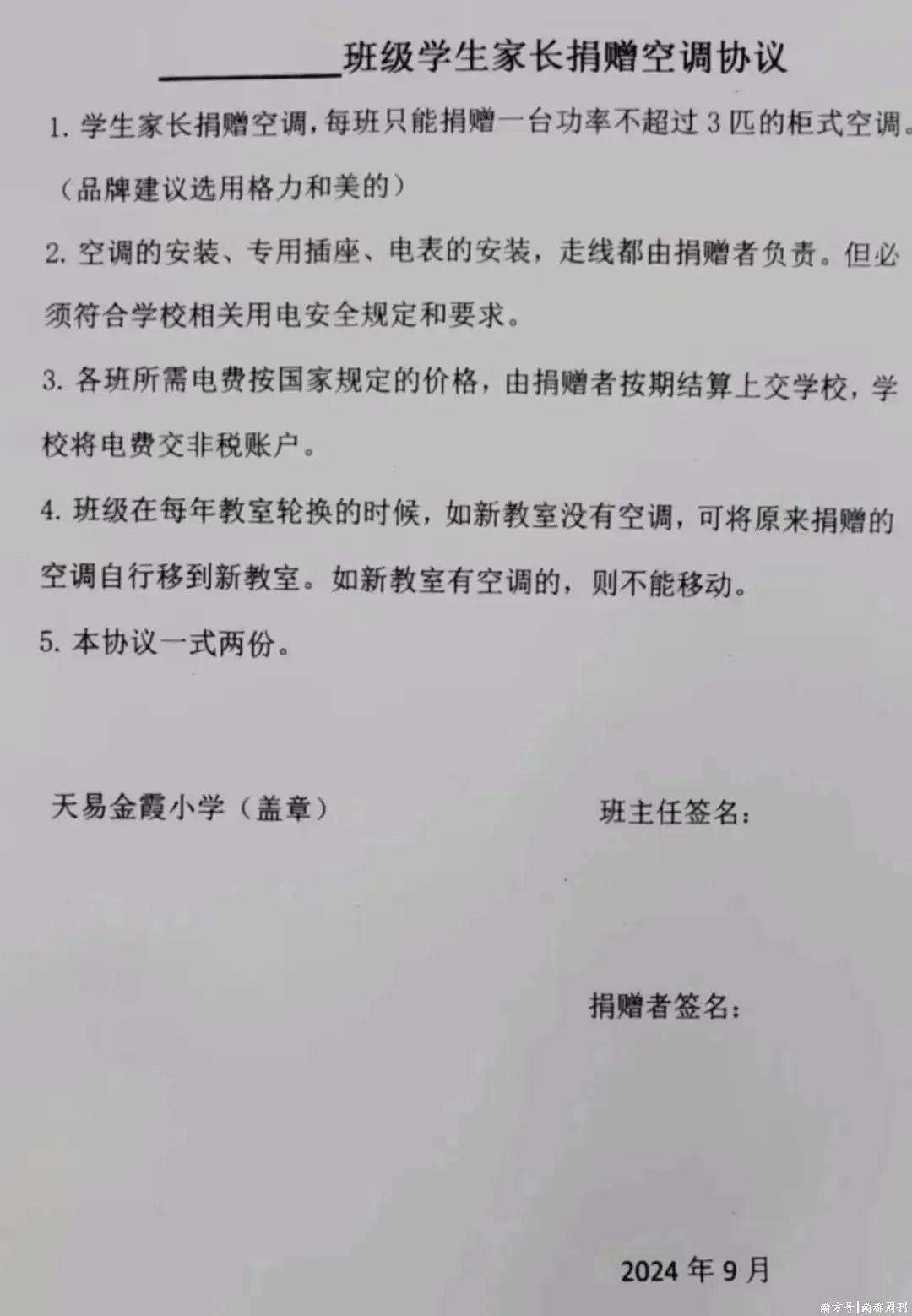 一位湖南湘潭的网友发布视频称,很多学生教室里没有空调,家长想捐空调给学校。一份落款为“天易金霞小学”的“学生家长捐赠空调协议”规定显示,学生家长为教室捐赠空调,安装、插座、走线都由捐赠者负责,电费由捐赠者按期结算上交学校。其中还提到,品牌建议选格力和美的。