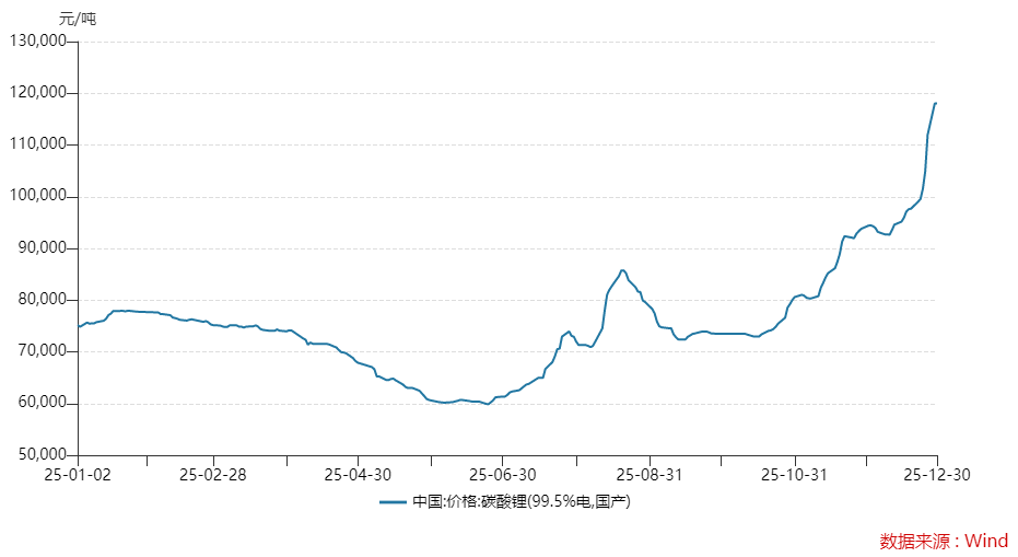 界面新闻查询看到,WIND数据显示,碳酸锂价格2025年年初价格在7.5万元/吨附近,在年中一度逼近6万元/吨。11月以来,碳酸锂价格强势反弹,12月30日报价已来到11.80万元/吨,自低位接近翻倍。不过这距2022年末超56万元/吨的历史峰值距离甚远。